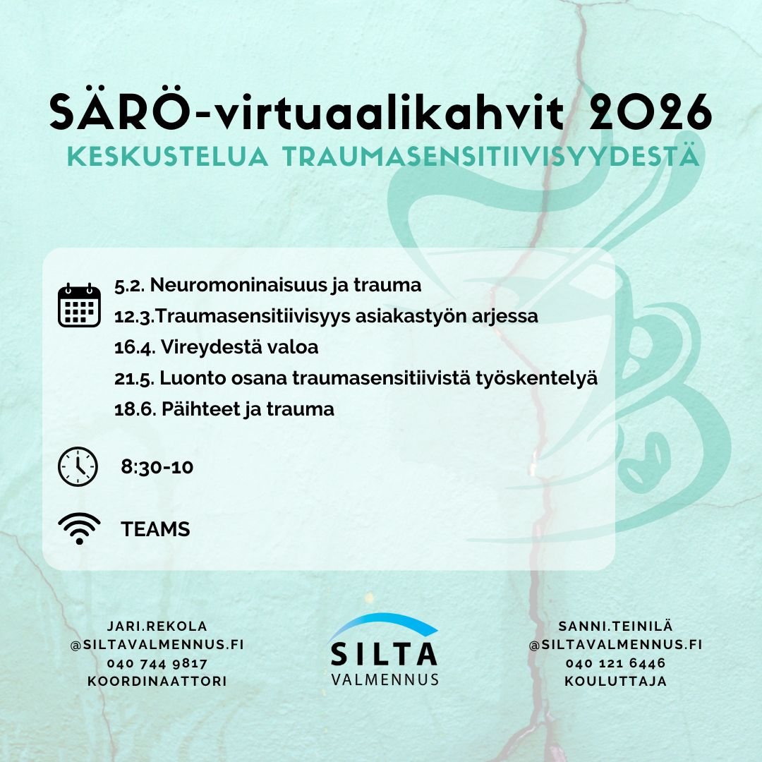Särön virtuaalikahvien tarkoituksena on tarjota erityisesti rikos- ja päihdetaustaisia kohtaaville ammattilaisille mahdollisuus pysähtyä keskustelemaan traumasensitiivisestä työotteesta – sen mahdollisuuksista ja haasteista. Traumasensitiivisen työotteen ylläpitäminen työyhteisössä vaatii säännöllistä keskustelua ja pysähtymistä aiheen äärelle. Ilmoittautumista ei tarvita.