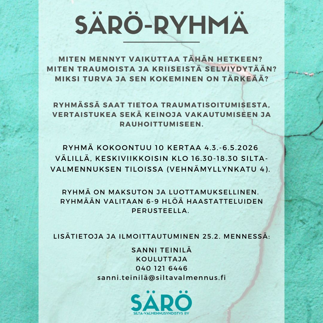 SÄRÖ-ryhmässä tarjoamme tietoa traumasta, traumatisoitumisesta sekä vakautumisesta. Lisäksi harjoittelemme yhdessä vakautumis- ja rauhoittumiskeinoja sekä vahvistamme harjoitusten avulla keho-mieliyhteyttä. Ryhmä tarjoaa mahdollisuuden vertaistukeen sekä omien kokemuksien jakamiseen turvallisesti. Ryhmässä ei kuvailla traumatapahtumia yksityiskohtaisesti uudelleentraumatisoitumisen ehkäisemiseksi.